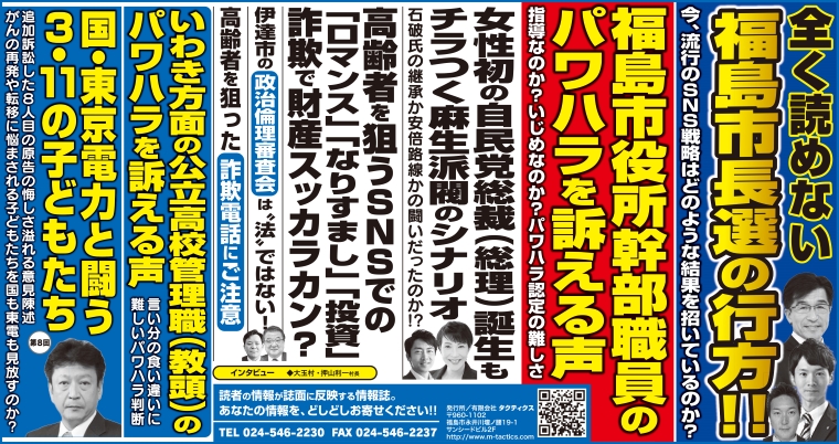 激戦? 全く読めない 福島市長選の行方 今、流行のSNS戦略はどのような結果を招いているのか? ![]() 論点 福島市役所幹部職員のパワハラを訴える声 指導なのか?いじめなのか?パワハラ認定の難しさ ワン評 いわき方面の公立高校管理職(教頭)の パワハラを訴える声 言い分の食い違いに難しいパワハラ判断 徹底検証 国・東京電力と闘う3・11の子どもたち <第8弾> 追加訴訟した8人目の原告の悔しさ溢れる意見陳述 がんの再発や転移に悩まされる子どもたちを国も東電も見放すのか? ![]() 世相斬り 女性初の自民党総裁(総理)誕生も チラつく麻生派閥のシナリオ 石破氏の継承か安倍路線かの闘いだった!! ![]() 詐欺にご注意 高齢者を狙うSNSでの「ロマンス」「なりすまし」 「投資」詐欺で財産スッカラカン? 緊急追跡 伊達市の政治倫理委員会は“法”ではない! ![]() 詐欺電話に気を付けよう 高齢者を狙った詐欺電話にご注意 人物ファイル 大玉村 押山利一 村長 小さなスケールメリットで村民の豊かで便利な生活環境を実現 |